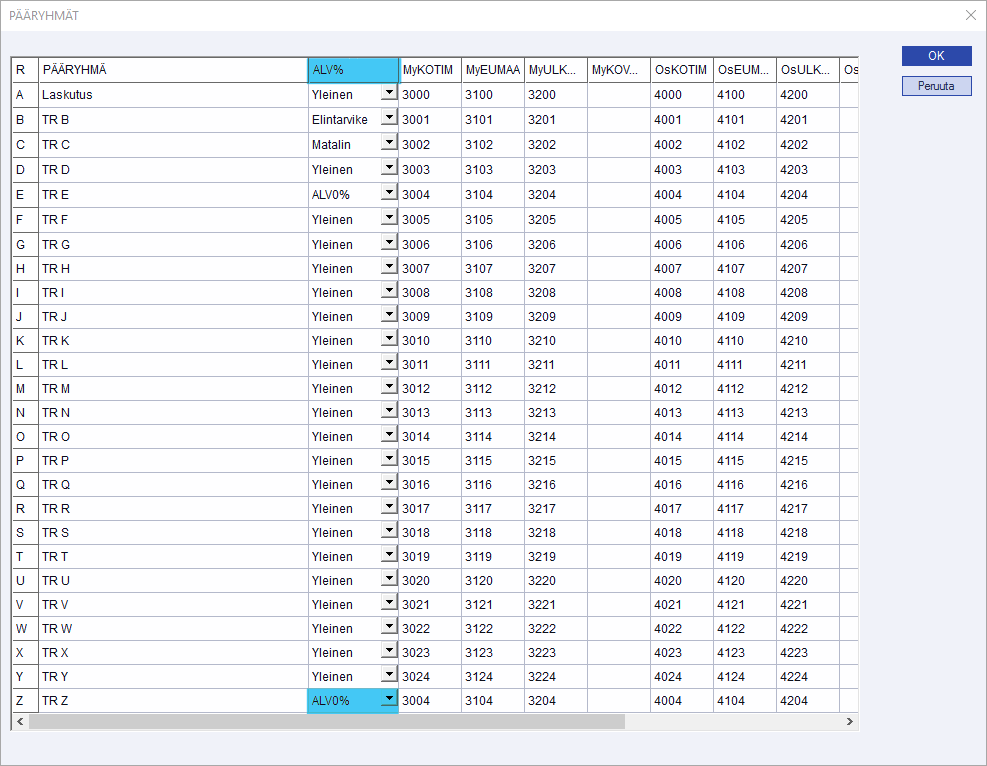 - jokaisella eri alv-kannalla tulee olla oma pääryhmänsä ja näihin liittyvät pääryhmäkohtaiset kirjanpidon myyntitilit määritellään tässä ikkunassa