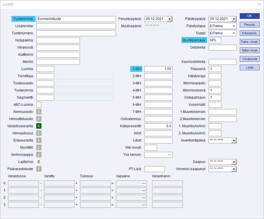 - 1-MH - 7-MH: Voit määritellä tuotteelle seitsemän erilaista myyntihintaa, ja määritellä asiakkaille, mitä näistä hinnoista kullekin käytetään, mutta myyntihinta ei ole pakollinen kenttä.