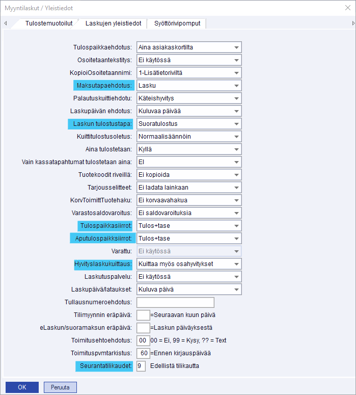 - Tulospaikkasiirrot: Siirretäänkö myyntilaskutuksen tulospaikkatiedot kirjanpitoon tulos- tai tasetilien vienteihin tai molempiin.