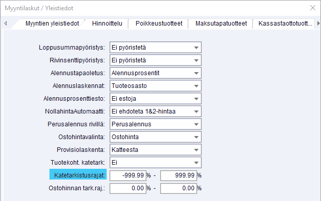 Määrittele katetarkistusrajaksi -999.99 – 999.99. Tällöin Maestro ei anna huomautusta katetarkistuksesta laskun kirjoituksen yhteydessä.