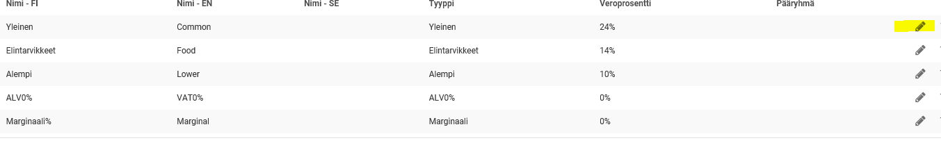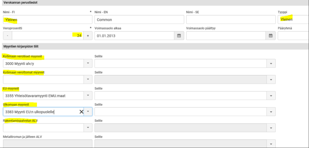 Alla esimerkki miten Pääryhmä Yleinen määritellään. Merkitse veroprosentti, nimi ja tyyppi vastaamaan verokantaa. Merkitse myös Pääryhmien tilit oikeaan kohtaan.