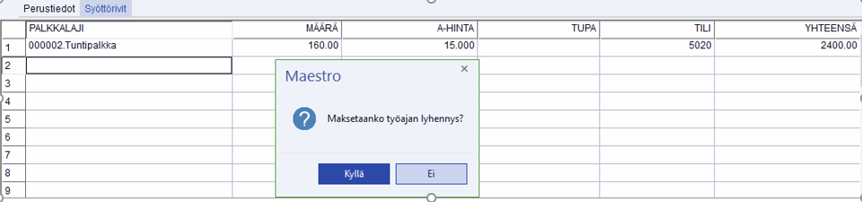 Kun käytössä on automaattinen työajan lyhennyskorvaus, työajan lyhennyskorvauksen palkkalajia ei tallenneta itse palkkakirjaukselle eikä lisätä vakiotapahtumiin, vaan palkkanauhaa hyväksyttäessä Maestro kysyy Maksetaanko työajan lyhennys? Vastaamalla tähän Kyllä, Maestro tuo korvauksen palkkalajin euroineen riveille.