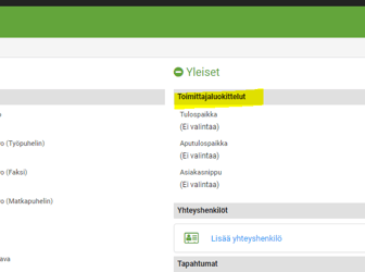 Kun tulospaikka on valittu käyttöön, näkyy toimittajakortilla oikassa yläkulmassa toimittajaluokittelut.