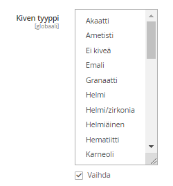 Attribuutit-välilehdellä etsitään se attribuutti, joka halutaan tuotteille antaa ( Esim. Kiven tyyppi) ja ominaisuuden alta täpätään “Vaihda”, jolloin ominaisuus tulee aktiiviseksi.