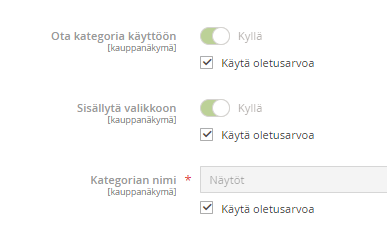 Ja tarkista, että kauppanäkymä käyttää myös niitä oletusarvoja, jotka on Kaikki kauppanäkymäkohtaisesti annettu. Jos asetukset on Ei - asennossa eikä "Käytä oletusarvoja" ole täpättäny niin täppää ne valituksi ja tallenna niin Kategoria näkyy kaupassa.