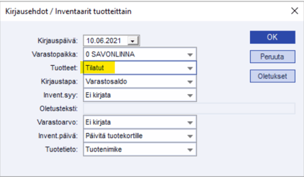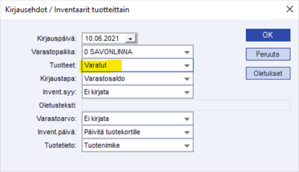 Valitse ensin oikea varastopaikka ja jos nimenomaan varattu - tai tilattu -saldoa muutetaan/nollataan, Tuotteet -riville valitaan: varatut tai tilatut