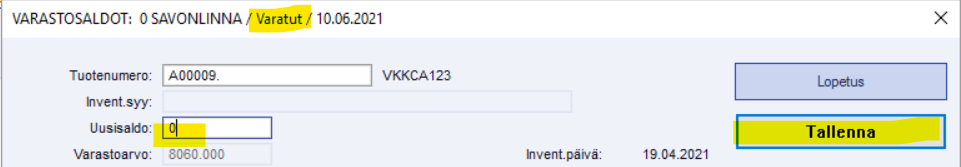 Tämän jälkeen anna ko. tuotteen varatut tai tilatut -saldoksi oikea määrä tai nollauksessa 0 ja paina lopuksi tallenna -painiketta.