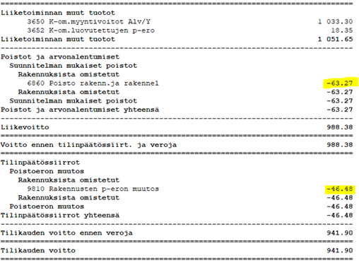 Eli alleviivatuista luvuista 46,62 sekä 46,68 voidaan nyt johtaa verolomakkeen 62 rakennusten poistomäärä 93,10 verottajan laskentatavan mukaisesti.