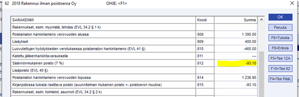 Esiverolomakkeella 62 laskettuna 7% poisto rakennusten menojäännöksestä on kuitenkin 93,10. Verottaja ei siis pysty johtamaan verolomakkeen 62 poistotietoa kirjanpidon tiedoin.