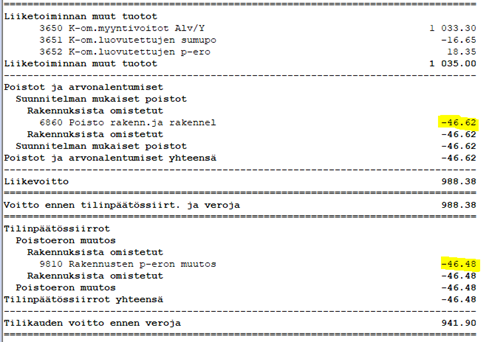 Suunnitelman mukaista poistoa on kirjattu (etumerkein) -63,27 sekä poistoeron muutosta -46,48, jolloin kokonaispoiston (tässä myös evl-poiston) tulisi olla -109,75 euroa.