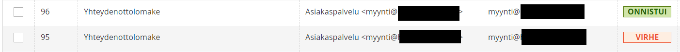 Mikäli sähköpostin lähetys asiakkaalle on onnistunut, on kyseisen rivin perässä Onnistui ja mikäli ei ole onnistunut niin rivin perässä lukee Virhe