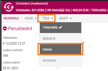 Kun olet täydentänyt laskun tiedot, saa lasku siirrettyä Valmis -välilehdelle Tila -valikon Valmis -valinnalla.