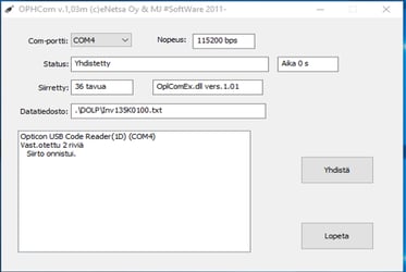 Kiinnitä inventointilaite OPH-1005 telakkaan ja kytke telakka usb-kaapelilla työasemaan kiinni. Ruudun oikeaan alakulmaan tulee ilmoitus ”Laite on valmis”. Avaa ohjelma OPHCom.exe työpöydälle tekemästäsi pikakuvakkeesta.