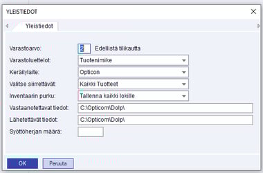Määrittele Maestrossa yleistiedot (Inventaarit -> Yleistiedot) kohdat: Keräilylaite: Opticon, Inventaarin purku: Tallenna kaikki lokille, Vastaanotettavat tiedot: C:\Opticom\Dolp\ sekä Lähetettävät tiedot: C:\Opticom\Dolp\. Konesaliasiakkailla levyasematunnus on V, jos Maestro on asiakkaan omalla työasemalla tai palvelimella työaematunnus on C.