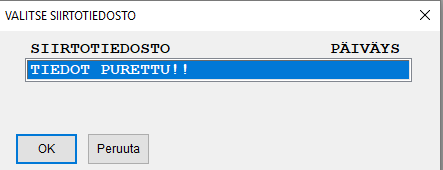 Hyväksy valinnat OK painikkeella, tämän jälkeen ohjelma pyytää vielä hyväksymään siirtotiedoston, paina tässäkin OK.