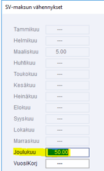 Sairausvakuutusmaksun vähennys euroina voidaan kirjata Palkat - Verotoiminnot - Sairausvakuutusvähennykset-osioon ennen sivukululaskelman muodostusta (sellaisten kuukausien vähennyksiä voi muokata, joista sivukululaskelmaa ei ole tehty).