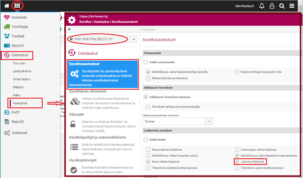 2. Laita MaestroNG:ssä päälle ostolaskujen sovellusasetuksissa asetus Jaksotus käytössä