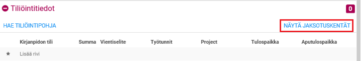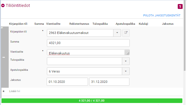 3. Jaksotettavalle ostolaskulle syötetään jaksotustiedot tiliöintirivikohtaisesti