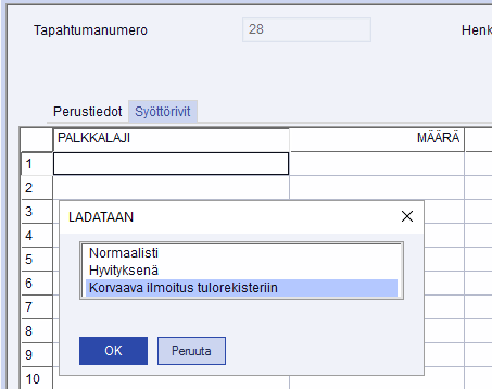 Korvaava ilmoitus tehdään kirjausriveillä painamalla F8 (tai vastaavasti hiiren oikean painikkeen takaa erikoistoiminnot) - Lataa syöttörivit/Korvaava ilmoitus tulorekisteriin. Ohjelma kysyy valinnan jälkeen sen palkkakirjauksen numeron, jolta kirjausrivit ladataan. Valitse lopuksi "korvaava ilmoitus Tulorekisteriin".