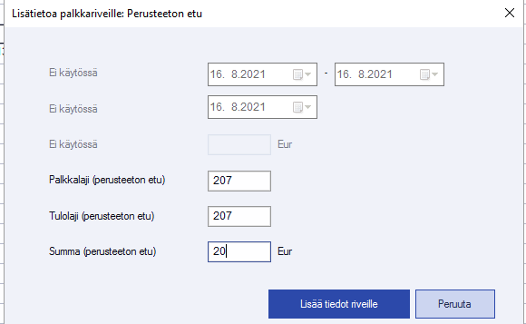Kirjoita perusteeton etu palkkariveille täsmälleen seuraavaan tapaan, tai valitse palkkariveillä F8 erikoistoiminnot/Lisätieto riveille: Perusteeton etu, jolla saat muodostettua rivin.
