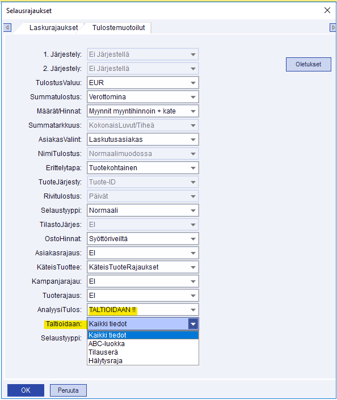Kun Analyysitulos on TALTIOIDAAN, avautuu seuraava valintasarake, jossa valitaan, mitä tietoja halutaan taltioida: