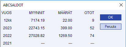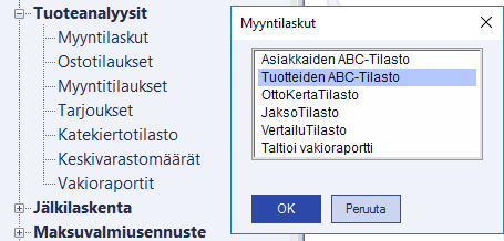 Ensin ajetaan Myyntilaskut > Tuotteiden ABC-Tilasto ja sen jälkeen OttoKertaTilasto. Vasta Ottokertatilasto, tallentaa tiedot tuotekortille.