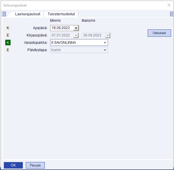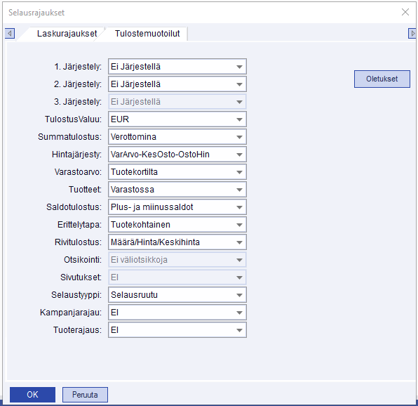 Tulostemuotoiluissa määritellään mm. Järjestelyt, haetaanko tuotteiden saldot Varastossa / Varatut / Tilatut / Vapaana -kentästä, sekä käytetäänkö tuoterajauksia: