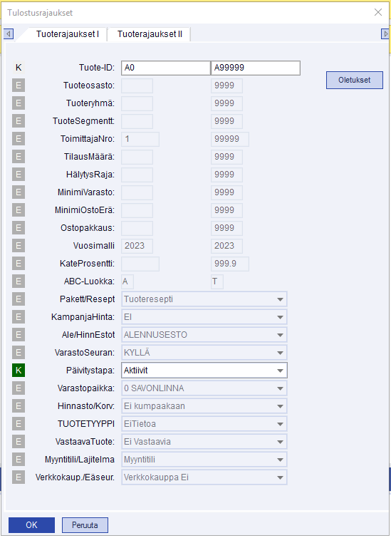 Jos käytetään Tuoterajauksia, seuraavaksi avautuu Tuoterajauksien ikkuna, jossa voidaan määritellä tuotteet, jotka tulostuvat raportille: