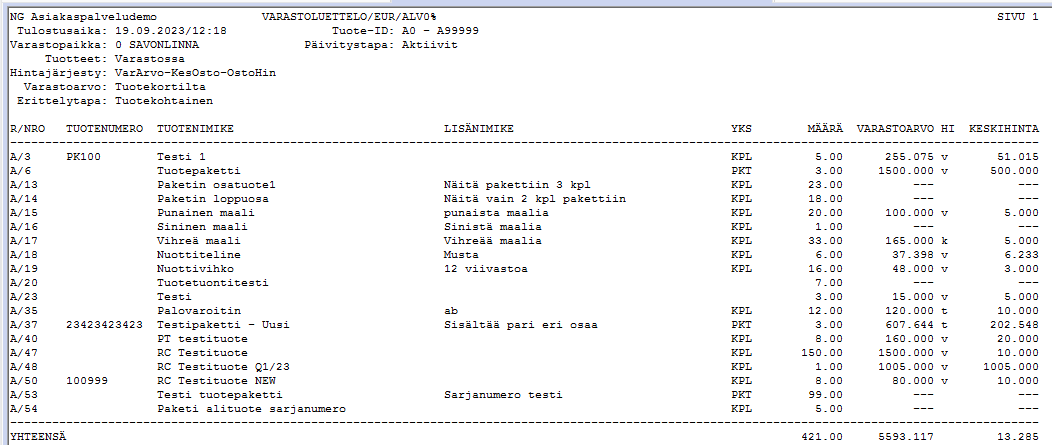 Riippuen tulostusvalinnoista sekä rajauksista saadaan otettua oheinen Varastoluettelo: