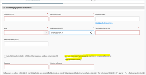Tässä tapauksessa tunnuksen voi luoda niin, että valitset kohdan "Luo instanssin tunnukseen ja etunimeen perustuva tunnus" ja sähköpostiosoite kenttään kirjoitat jonkun kuvitteellisen sähköpostiosoitteen. Tämä ei vaikuta mihinkään sähköposti-ilmoituksiin, mikäli niitä otetaan käyttöön koska oikea sähköpostiosoite määritellään henkilökortin kautta.