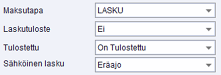 - Sähköinen lasku kentän arvoksi kannattaa valita Eräajo, jotta laskua ei turhaan koiteta lähettää Ropolle Suora Lähetyksenä. Lasku on jo lähetetty, joten Suora Lähetys jäisi virheeseen.