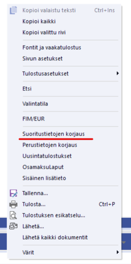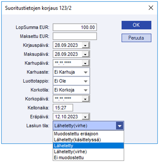 Sieltä hiiren oikean takaa 'Suoritustietojen korjaus' ja valitkaa Laskun tila: Lähetetty