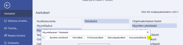 Tämä onnistuu seuraavasti: Valitse Tiedosto → asetukset → myyntitilaukset → yleistiedot → myyntien yleistiedot ja välilehti Avoimet tilaukset (valitse välilehdistä äärimmäisenä oikealla oleva välilehti vierittämällä välilehtiä oikealle, keltaisella korostettu kohta):