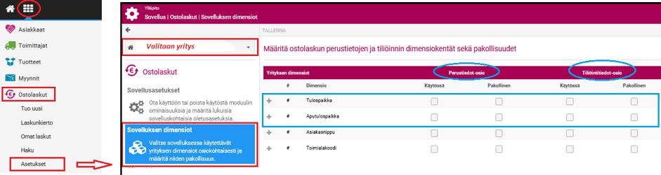Sovelluskuutio => Ostolaskut / Asetukset => valitaan yritys => Sovelluksen dimensiot