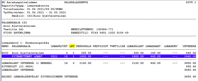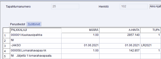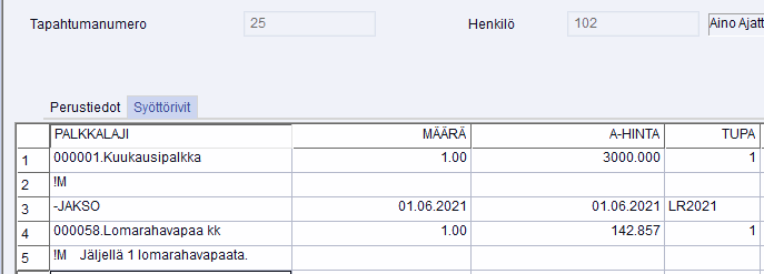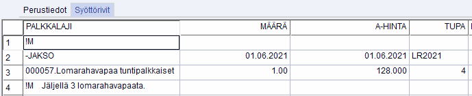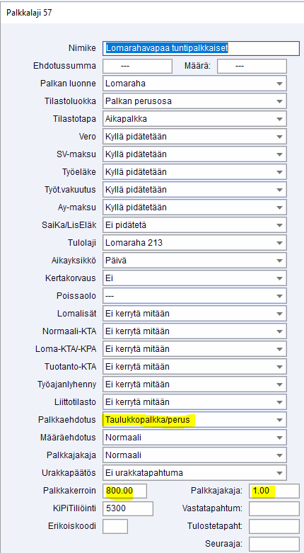 Tässä esimerkissä tuntipalkkaisen lomarahavapaan hinta on laskettu siten, että palkkaehdotus lomarahavapaan hinnan laskentaan on otettu henkilökortin taulukkopalkka/perus -kentästä. Tämä kerrotaan 8 (palkkakerroin 800), eli kokonaisuudessaan tämä menisi kaavalla peruspalkka x viikkotyöaika/5.