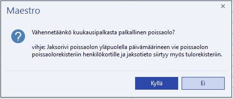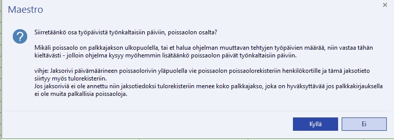 Kun kirjausikkunasta edetään OK:lla, kysyy ohjelma siirtoa työnkaltaisiin päiviin ja vähennystä kuukausipalkasta: