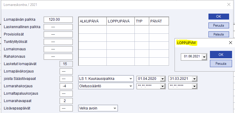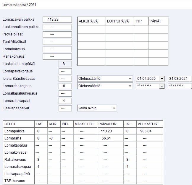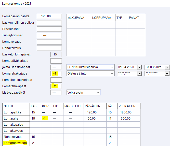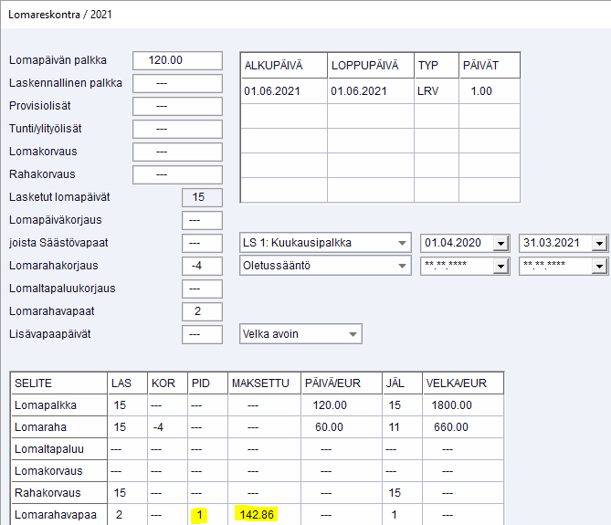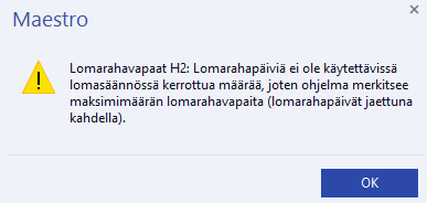 Jos henkilöllä ei ole käytettävissä lomasäännössä kerrottua lomarahavapaiden määrää, tulee lomareskontran taltioinnissa seuraava ilmoitus ja henkilökortille tallentuu maksimimäärä, joka on käytettävissä.