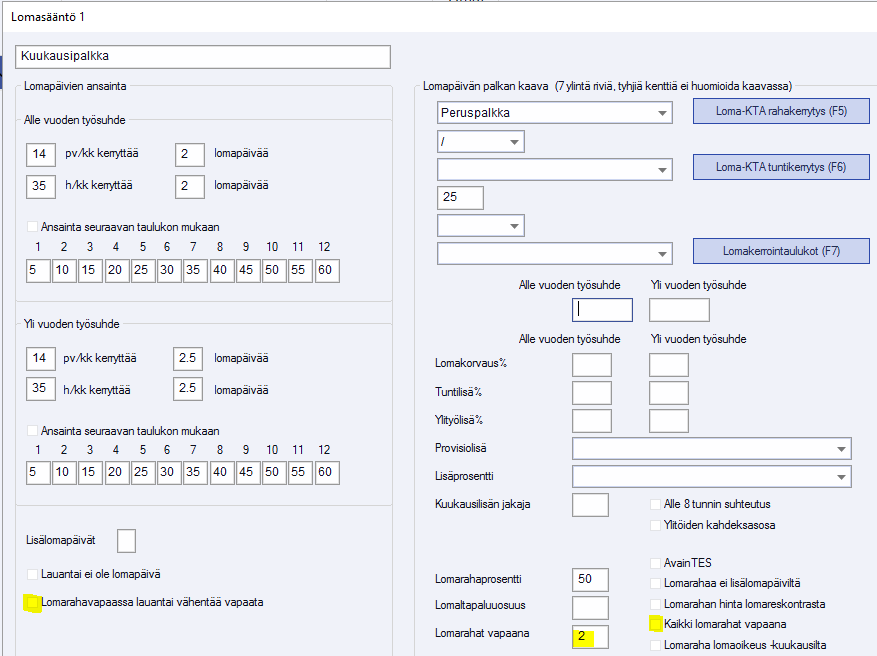 Lomasäännössä määritetään montako lomarahapäivää pidetään vapaana. Esimerkiksi, jos kenttään "lomarahat vapaana" määritetään 2, tarkoittaa se sitä, että henkilökortille lomareskontraan taltioituu lomarahavapaat -kenttään 2 pv ja lomarahoista poistuu automaattisesti 4 pv, koska oletuksena vapaita annetaan puolet lomarahapäivien määrästä.