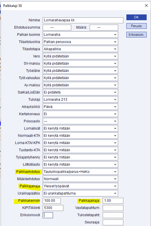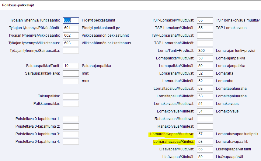 Tiedosto - palkat - yleistiedot - poikkeus-palkkalajit -ikkunaan määritetään palkkalajit, joilla lomarahavapaita kirjataan.