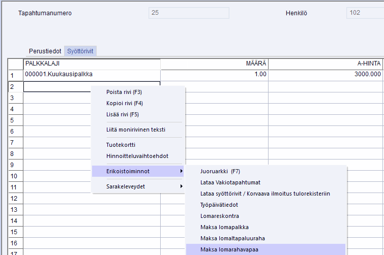 Lomarahavapaan kirjaamiseen on palkkakirjauksella hiiren oikean painikkeen takana erikoistoiminnot (tai vastaavasti F8) - maksa lomarahavapaa -toiminto.