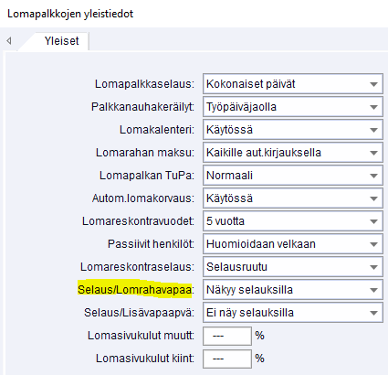Lomapalkat - yleistiedot -ikkunassa on mahdollista valita lomarahavapaa lomalaskennan selauksille näkyviin: