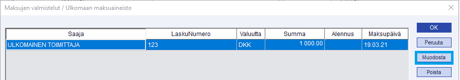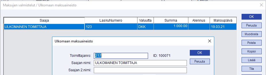 Jos ulkomaan maksuaineiston maksunipun muodostaminen ei onnistu, vaan toimittajavalinnan jälkeen yhtään maksua ei löydy (Yhden toimittajan avoimet maksut 0 kpl), tarkista toimittajakortin Valuutta-tieto. Jos valuutaksi on määritelty EUR, maksunipun muodostaminen ei ole mahdollista, vaikka maksuun olisikin määritelty toinen valuutta.