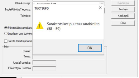 Tuoteupd-ajossa tulee virhe: "Sarekeotsikot puuttuu sarakkeilta". Virheilmoitus johtuu siitä että käytössä on vanhaa taulukkopohja Tuoteupd-ajossa.