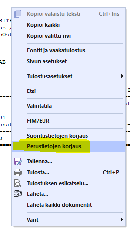 Hiiren oikealla avautuvasta valikosta valitaan Perustietojen korjaus