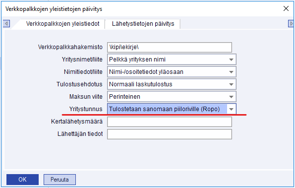 > Kohdassa Yritystunnus tulee olla valintana aina 'Tulostetaan sanomaan piiloriville (Ropo)'.