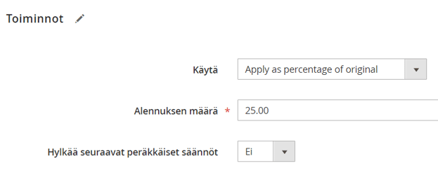 Toiminnot-välilehdellä määritellään annetaanko alennus prosenttina vaiko euroina sekä alennuksen määrä