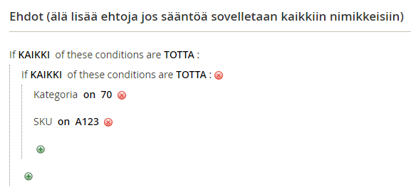 Alla olevassa erimerkissä on käytetty ehtoa, jolloin kaikkien ehtojen tulee olla totta alennuksen saamiseksi. Ehtoja ei tarvitse määritellä mikäli alennus koskee kaikkia tuotteita.