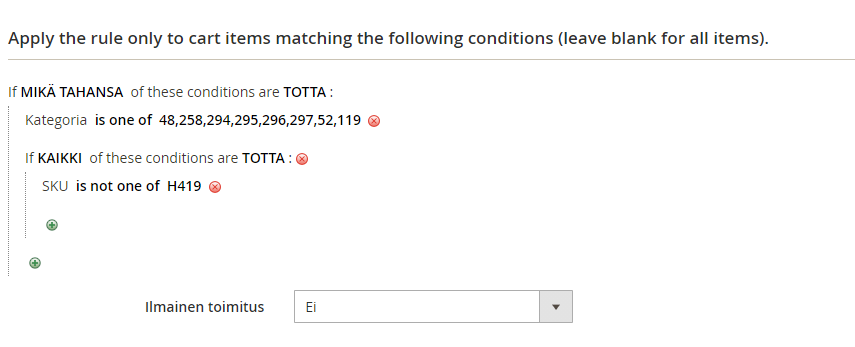 Alennuskoodilla (ostoskorin hintasääntö) alennus annetaan useammalle kategorialle ja alennuksesta rajataan pois ne tuotteet, joista ei alennusta saa. Täältä voit tarkistaa Ostoskorin hintasäännön tekemisen kokonaisuudessaan.