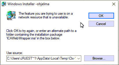 Selaa puuttuva tiedosto kansiosta, jonne purit asennustiedoston,