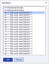 Perusrekisterit - Viestiasetukset - Vakiotekstien päivitys - Valitaan haluttu kieli - Lisätään uusi vakioteksti kohdasta ***TEE UUSI VAKIOTEKSTI*** tai muokataan olemassa olevaa tekstiä valitsemalla haluttu vakioteksti ja tehdään tarvittavat muokkaukset tekstiin - Tallennetaan OK: